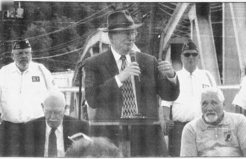 ProfilesMaster of Ceremonies, Dennis Tice of the Bedford County Visitors' Bureau speaks to the audience during the dedication of the Sgt. Robert Hartsock Bridge. Seated to the left is Rep. Dick Hess and to the right is Larry Garlock of Bedford County Vietnam Veterans Association. The Everett Honor Guard is in the background.