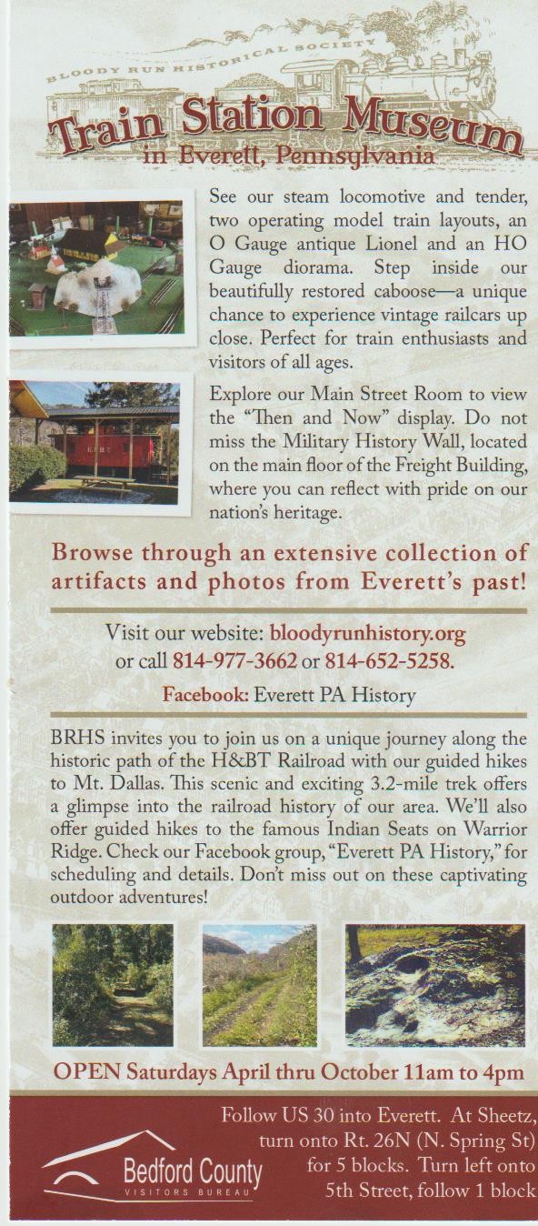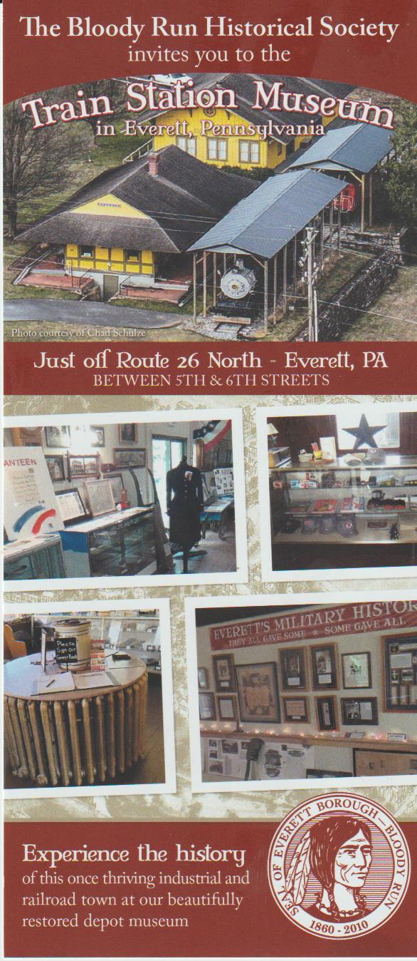 Bloody Run Historical Society 49 West 5th Street Everett, Pa. 15537 814-617-0635 Email: brhseverett@gmail.com Facebook: Everett, PA. History The museum is open every Saturday April thru October 11 a.m. to 4 p.m.